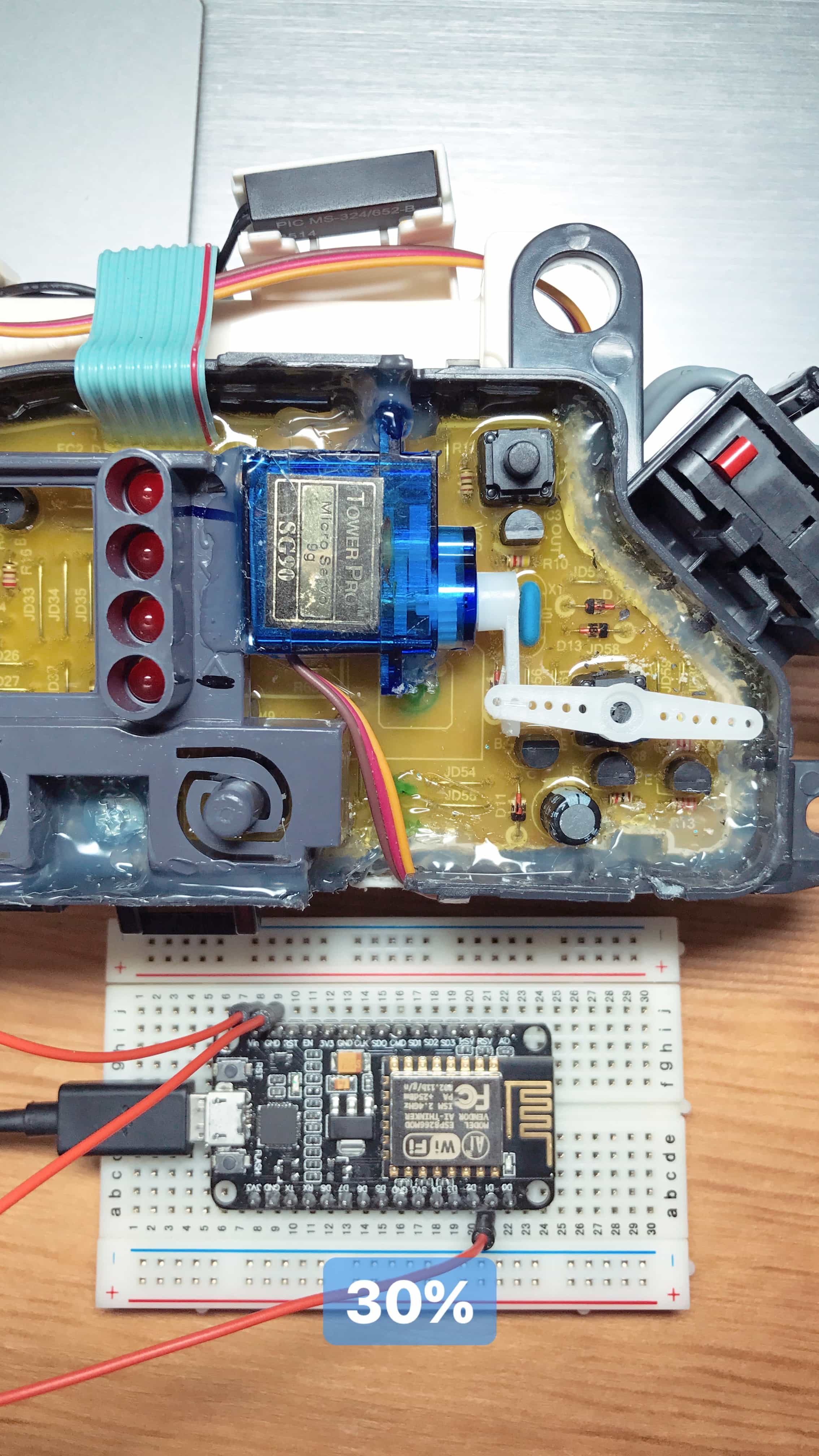 至於,模擬被防⽔處理的啟動/暫停按下的部分,最後的解決方案採用了伺服⾺達(藍)。