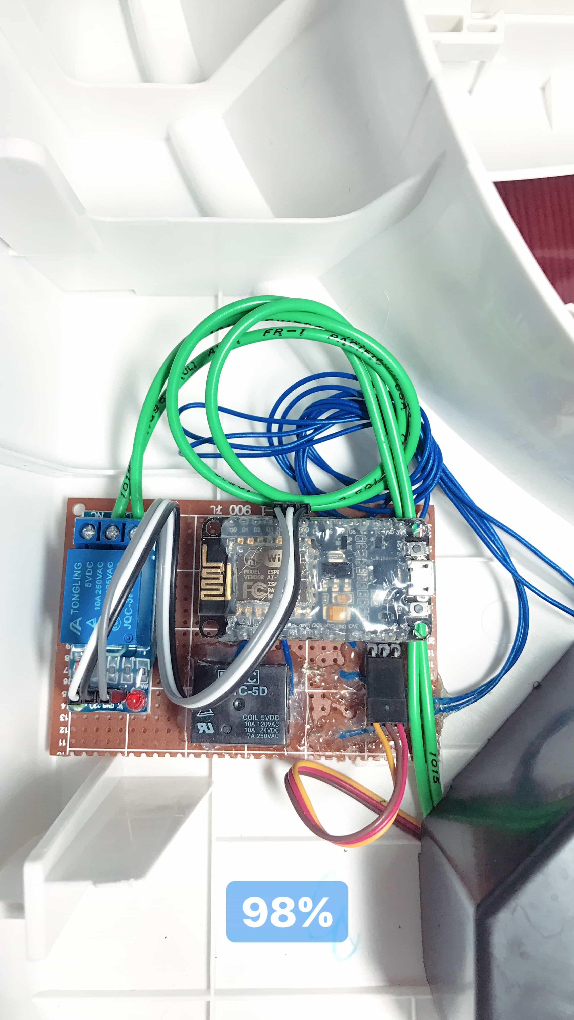 拆下洗衣機的控制面板,開是個外接的微動開關(紅),焊接導線(綠)連接繼電器(藍)即可。