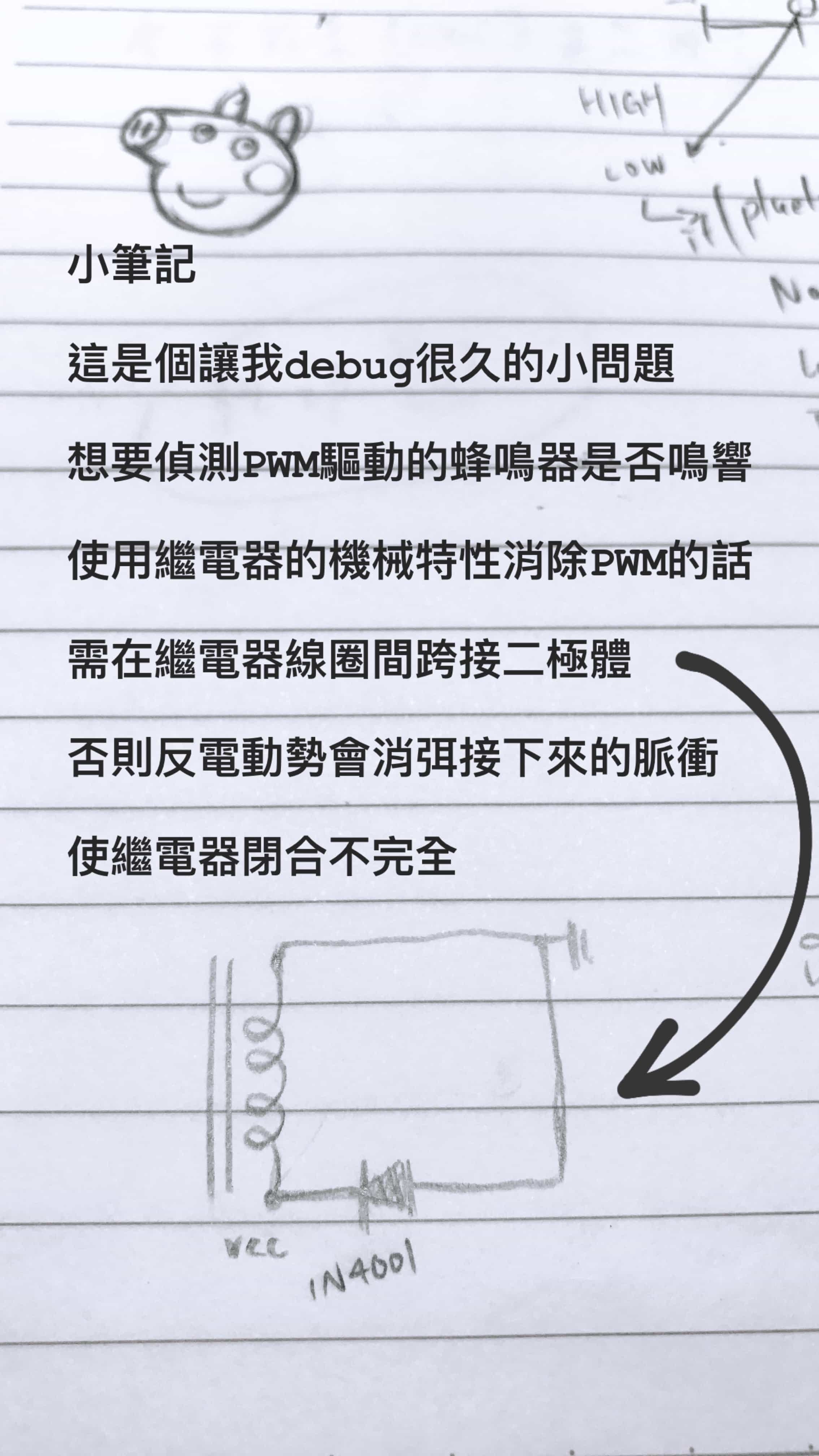 值得注意的是,繼電器有線圈結構,故會產⽣反電動勢,需要於線圈上跨接⼀個⼆極體。