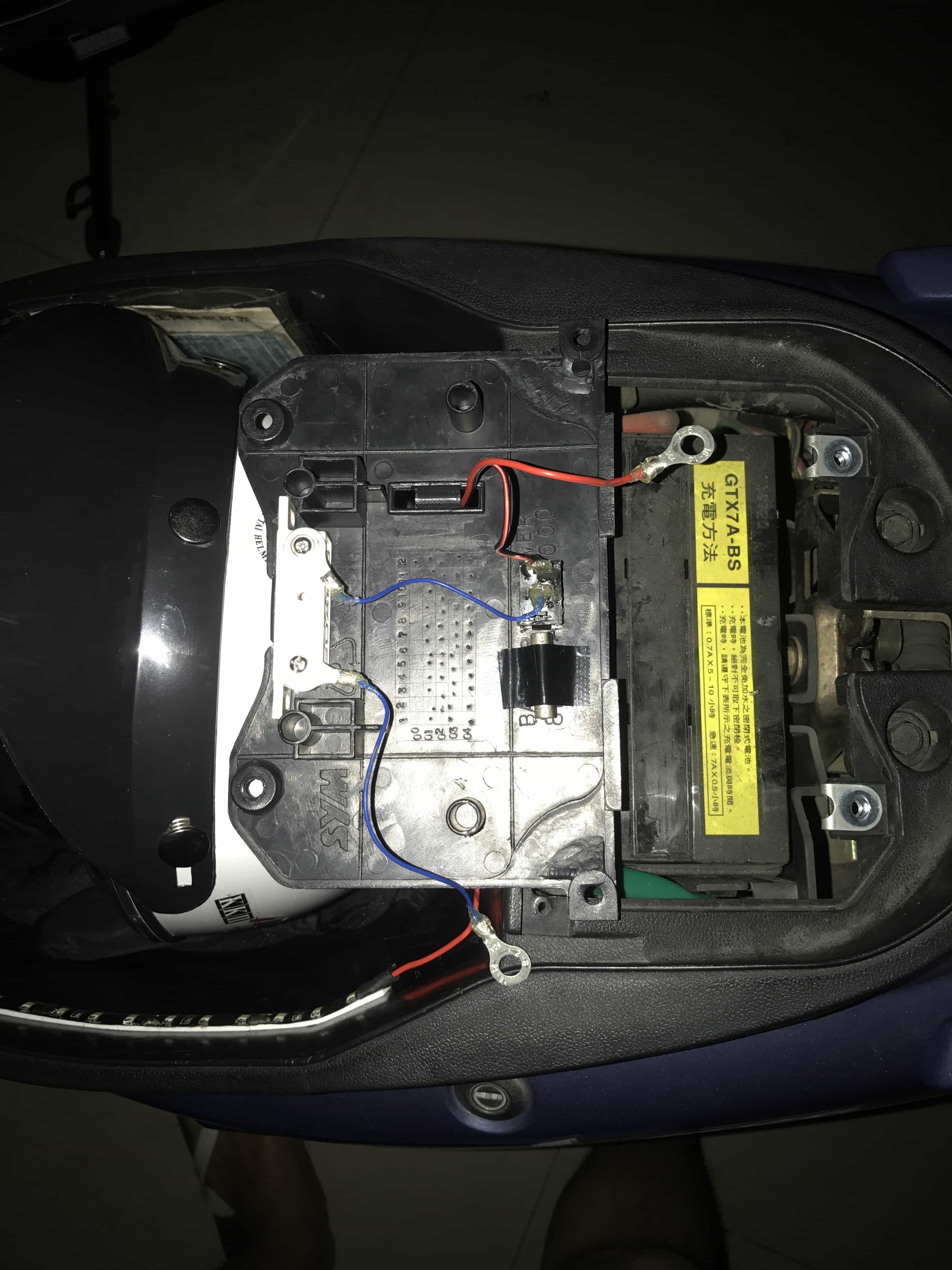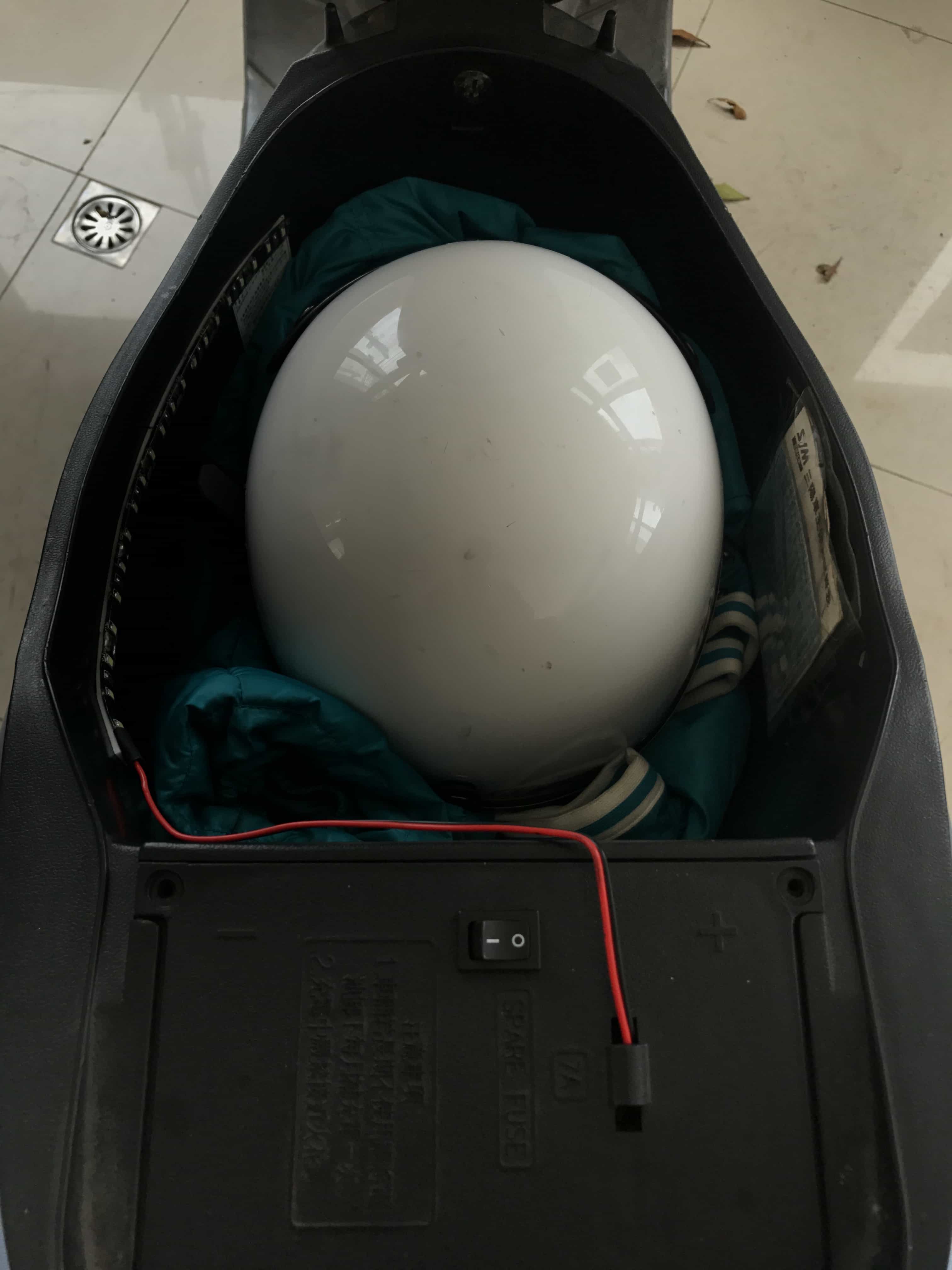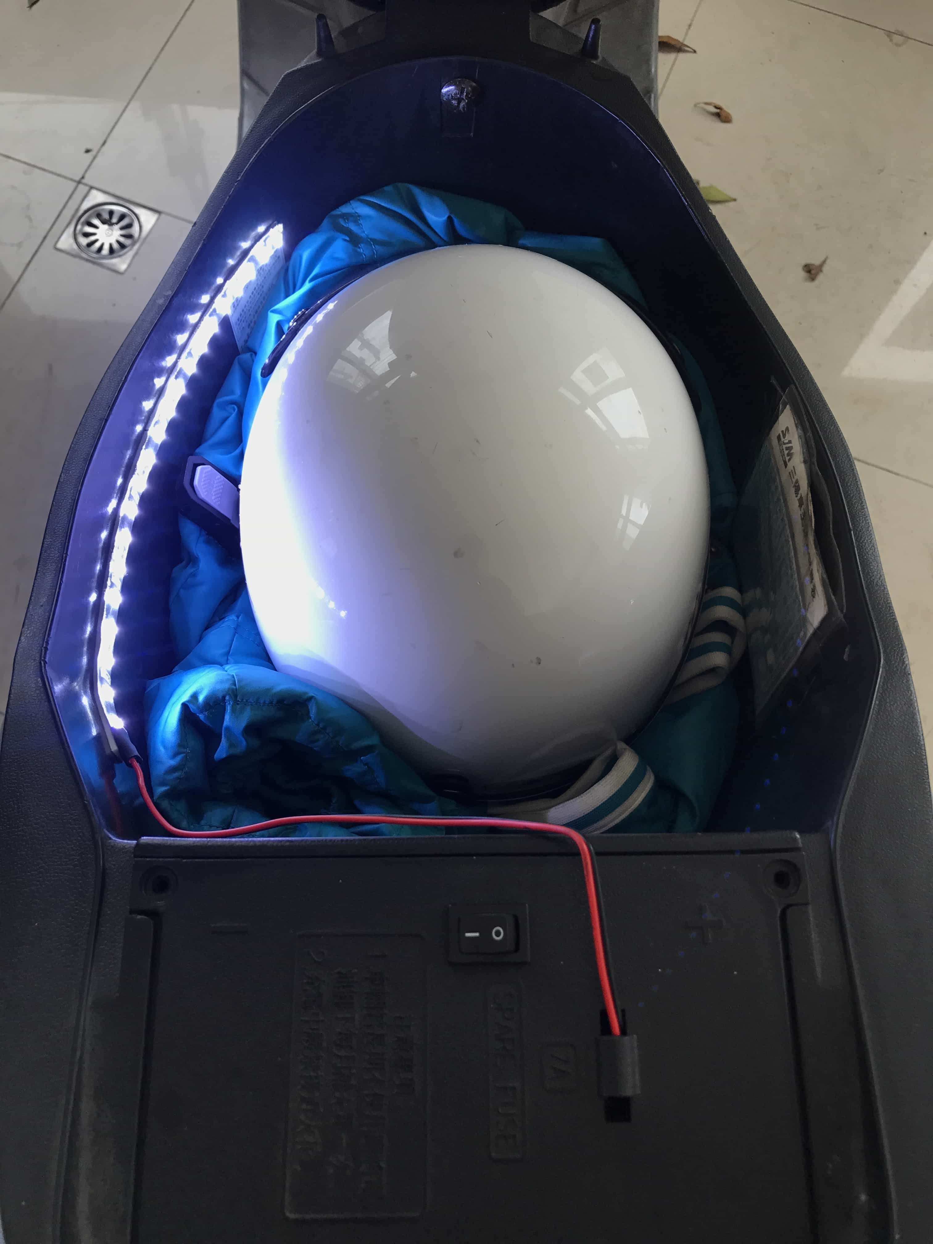 機⾞電池剛好在置物箱的後部,便於接線,起初只有安裝燈條與開關各一,⼀切控制都是⼿動完成。